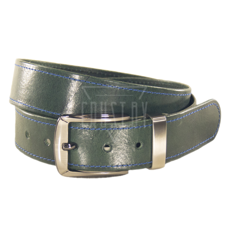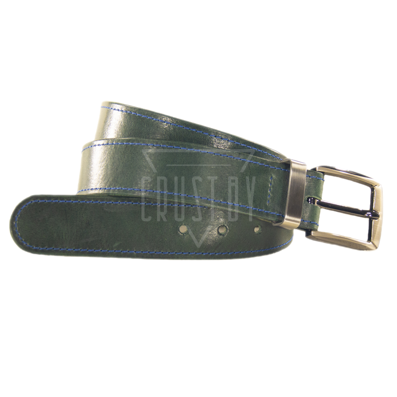 Кожаный натуральный ремень серии Стандарт зелёного цвета, прошит синей нитью. Для изготовления используется кожа комбинированного дубления и пряжка из сплава ZAMAK (ЦАМ) с покрытием. Структура ремня гладкая, нижняя поверхность (бахтарма) максимально строганная и ровная. Ремень пропитан водоотталкивающими составами, на ощупь приятный, кожа мягкая, но прочная. Идеальный вариант для повседневной носки, а также для стильного образа.